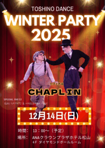 2025年9月3日 / パーティー情報, 新着情報 ★ウィンターパーティー2025のお知らせ★ 俊野ダンススタジオ ウィンターパーティー2025のお知らせです。 今年は12月14日(日)ANAクラウンプラザホテル4Fダイヤモンドボールルームにて 開催いたします。 スペシャルゲストは、全日本ファイナリストの関勇人・長谷川真希組です! セグエ、そして迫力あるラテンをお楽しみに♪ 皆さまに楽しんでいただけるよう、心を込めて準備しているところです。 チケットなどは決まり次第またお知らせします。 詳しいことはお気軽にお問合せください!